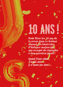Pour fêter les 10 ans de la revue dans ce format annuel, les bénévoles d’Enfance majuscule ont accepté de répondre à une question posée : « Quand j’étais enfant, j’aurais aimé… je n’aurais pas aimé… »